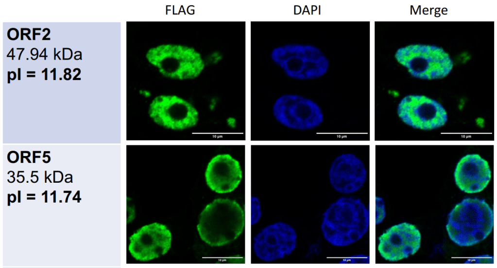 Subnuclear localisation of 2 eORF proteins. FLAG, tag marking the location of the protein; DAPI, DNA staining. pIs are >11, suggesting these are heavily basic proteins. Adapted from Vlasov et al., figure 3A.